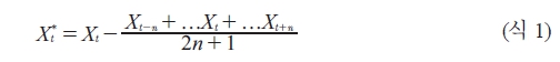 여기서, Xt*는 필터링기법으로 얻은 값이며, Xt는 t 시간에서의 측정된 값, n은 Xt 값 전후의 n 개의 수를 나타낸다.