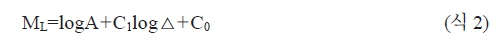 식에서 는 지진 기록의 최대진폭을 의미하며, 는 진앙거리, C0과 C1은 규모 결정 계수를 의미한다(KIGAM, 2024). 이를 통해 규모와 진앙거리의 상관관계가 존재하고 있음을 보여준다.