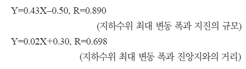 지진 규모와 진앙거리에 따른 지하수 변동 크기 역시 비례 관계가 보임을 확인하였다. 각각의 상관관계 식과 상관계수는 아래와 같다(Fig. 7).