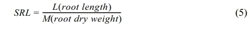 뿌리 길이와 부피 측정법은 다음과 같다. 사진 포맷을 Image J(Schneider et al., 2012) 프로그램으로 8 비트 RGB로 변환하고, SmartRoot 프로그램(Lobet et al., 2011)으로 변환된 이미지를 읽었다. 축척에 해당하는 픽셀수와 1차근 및 측근(lateral root) 뿌리의 시작점을 지정하면, 프로그램이 음영을 기준으로 픽셀단위로 식물 뿌리를 인식하고, 뿌리 길이, 두께 및 부피를 계산하였다. 이 자료를 바탕으로 SRL(Specific Root Length)를 산정하였는데, 이는 단위중량당 뿌리 길이로 식물생체 건강성 및 스트레스, 토양 비용도를 간접측정 지표이다(Eissenstat, 1991; Kramer-Walter et al., 2016).