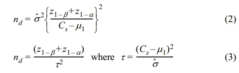 본 부지의 조사 지점수 결정을 위한 통계적인 신뢰수준은 95%, 위양성율과 위음성율은 각각 0.05, 0.20을 적용하였으며, US EPA(1989)에서 제안된 식 (2), 식 (3) 및 검정곡선(Fig. 5)을 비교하였다.