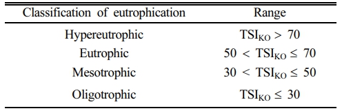 Carlson(1977)은 호소의 영양상태를 정의하고 부영양화를 분류하기 위한 방법으로 Trophic State Index(TSI)를 제시하였는데, 본 연구에서도 이 지수를 사용하였다. TSI는 아래와 같이 chlorophyll-a, T-P, 투명도(Secchi disk; SD)를 고려하며, 조류를 제한하거나 변수에 영향을 미치는 요인과 관련된 변수 간의 상호 관계를 이용한다(Carlson and Simpson, 1996). Chlorophyll-a와 SD는 조류의 생물량을 추정할 수 있으며, T-P와 T-N은 영양염류의 부하와 영양상태와 연관이 있어 변수들은 서로 연관성을 가지고 있다(Carlson, 2007). 영양상태를 0부터 100까지의 수치로 나타내고 이 지수가 10씩 증가함에 따라 투명도가 1/2로 감소하여 투명도가 64일 때 TSI가 0인 것으로 한다(Carlson, 1977). Chlorophyll-a, T-P, SD를 적용한 TSI는 계산한 변수가 30 이하일 때 빈영양호(oligotrophic)로 하며, 30 초과 60 이하를 중영양호(mesotrophic), 60 초과 70 이하를 (eutrophic)로 한다. 그리고 70을 초과하는 TSI는 과영양호(hypereutrophic)라고 한다(Table 1).