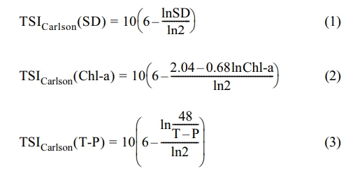 위 식에서 SD는 투명도(m), Chl-a는 chlorophyll-a (mg/m3)이며, T-P는 총인(mg/m3)이다.