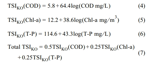 위 식에서 COD는 COD (mg/L), Chl-a는 chlorophyll-a (mg/m3)이며 T-P는 총인(mg/L)이다.