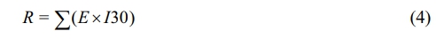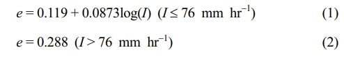 여기서, E는 유효 강우 사건의 총 운동에너지(MJ ha-1)이며, I는 단위 시간에 대한 강우강도(mm hr-1), t는 강우 지속 시간(hr)이다. (R)USLE 모형에서는 1년 동안 발생한 모든 유효 강우 사건에 대하여 식 (4)를 이용하여 R factor를 산정한다.