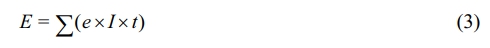 여기서, e는 개별강우의 운동에너지(MJ ha-1 mm-1), I는 강우강도(mm hr-1)를 나타낸다. 개별강우의 운동에너지, 시간 단위별 강우강도, 강우 지속 시간을 이용하여 유효 강우 사건의 총 운동에너지는 식 (3)과 같이 계산된다.