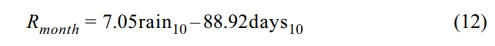 Loureiro and Coutinho(2001)는 포르투갈 Algarve 지역을 대상으로 월별로 추출된 10 mm 이상의 강우 시 강우량(rain10)과 10 mm 이상 강우 일수(days10)를 변수로 하는 다변량 선형 회귀 모형(multiple linear regression model)을 제시하였으며, 이는 식 (12)와 같이 나타낼 수 있다.