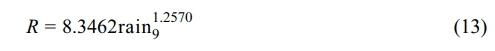 Fu et al.(2005)은 중국 황투고원(Loess Plateau)에서 토양 침식량을 평가하기 위해 월별 일 강우량이 9 mm를 초과하는 날의 강우량(rain9)을 변수로 하는 식 (13)과 같은 멱함수 모형을 이용하여 R factor를 추정하였다.