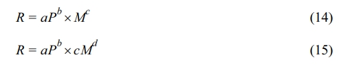 Risal et al.(2016)은 한국의 25개 도시에 대하여 10분 간격의 고해상도 강우 데이터를 활용하여 계산된 R factor를 예측하기 위한 회귀 모형을 제안하였다. 이 연구에서 월별 30분 최대 강우강도(I30max)가 역이차 모형(reciprocal quadratic model)의 분포를 따른다는 관찰을 바탕으로, 월별 강우량(P)과 월(M, 1-12)을 독립변수로 하는 회귀식을 도출하였다. 제안된 회귀 모형은 지역별 특성을 반영하여 식 (14) 및 식 (15)와 같은 형태로 표현되며, R factor 추정의 정확성을 75% 이상으로 향상하는 것으로 보고되었다.