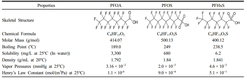 대부분의 과불화화합물은 실온에서 결정질 또는 분말 형태의 고체로 존재한다. 예외로, 과불화화합물 중 구조식이 짧은 화합물(the acid forms of PFCA(Perfluoroalkyl Carboxylic Acid) and PFSA(Perfluoroalkyl Sulfonic Acid), FTS(Fluorotelomer Sulfonate) and FTOH(Fluorotelomer Alcohol) with a 4- to 6-carbon tail)의 경우 실온에서 액체 형태로 존재하는 경향이 있다. 과불화화합물의 녹는점과 끓는점은 대체로 불소화 사슬의 길이가 증가함에 따라 증가하는 경향이 있다. 예로 PFBA(C3F7COOH)의 녹는점은 -17.5oC이고 PFTeDA(C13F27COOH)의 녹는점은 130~135oC이다. 과불화화합물은 독특한 화학 구조로 인해 친수성과 소수성을 동시에 가지는 특성을 보인다. 소수성을 지니는 과불화탄소사슬(-CnF2n+1)과 친수성을 지니는 수용성 작용기(-COOH, -HSO3 등)로 이루어져 있다(ATSDR, 2019; NCBI, 2025). 주요 과불화화합물은 흡착성이 낮아 토양에 잘 흡착되지 않는다(Zareitalabad et al., 2013; Brusseau et al., 2020). 이러한 특성으로 지하수로 쉽게 침투하며, 오염범위가 쉽게 확산될 수 있다. 주요 과불화화합물의 물리화학적 특성은 Table 1과 같다(NCBI, 2025).