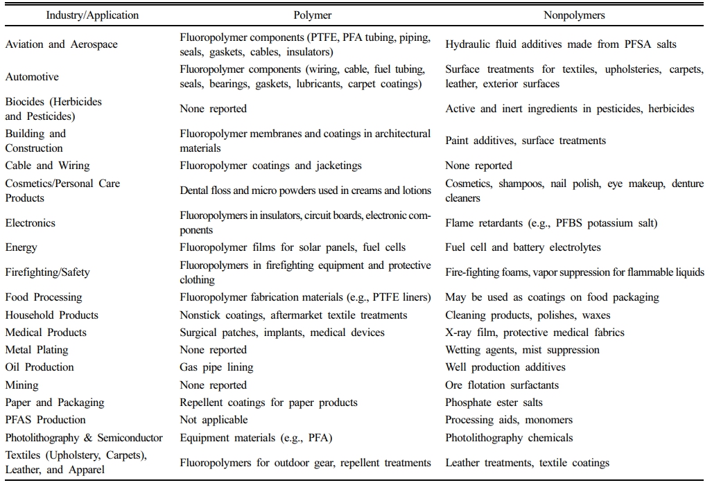 과불화화합물은 다양한 산업에서 활용되고 있다. 대표적으로 과불화화합물 중 PFOS는 반도체 코팅제, PFOA는 의류·조리기구 코팅제 및 소화제 등의 원료로 사용된다. 이와 같은 산업단지 주변과 과불화화합물 소비재를 사용하는 다양한 곳에서 지하수로 유출된다(Lee et al., 2025). 과불화화합물은 전 세계적으로 지하수에서 검출되고 있으며, 특히 산업 활동이 활발한 지역이나 소방 연료가 사용된 지역에서 높은 농도로 검출되고 있다(Johnson et al., 2022). 과불화화합물이 사용되는 주요 분야와 용도는 Table 3과 같다(ITRC, 2025).