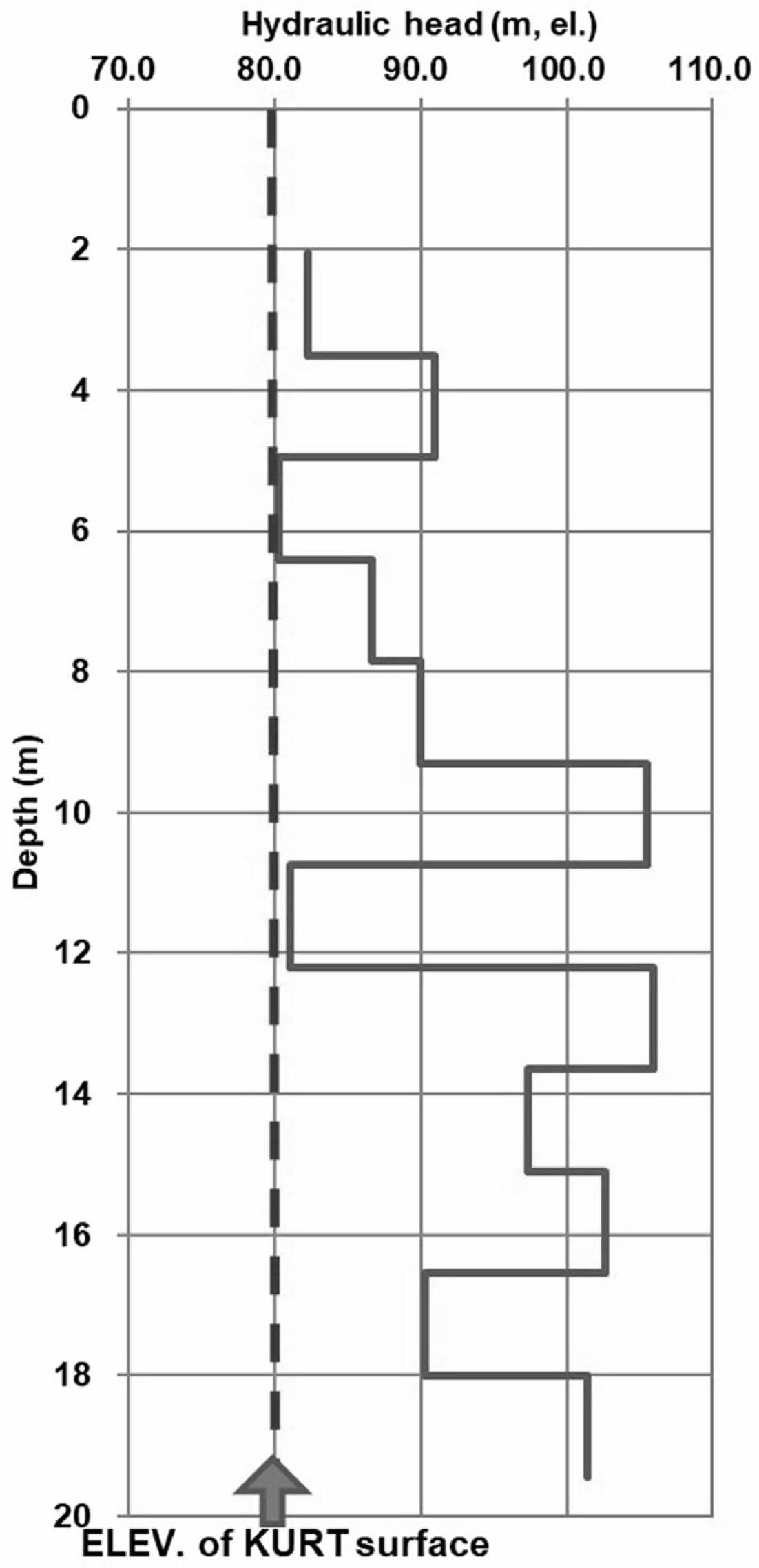 Fig. 2 Variations in groundwater levels along the depth in the KURT BDZ-1 borehole (Park et al., 2020). |