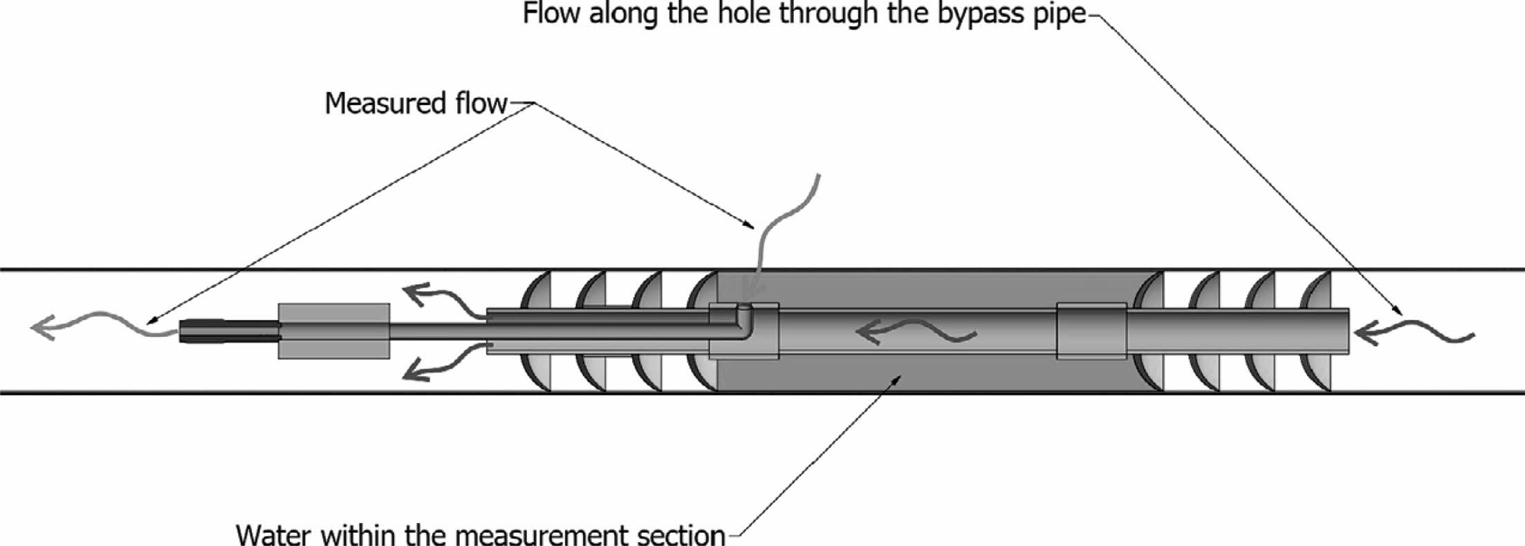 현재까지 국내에서 다중심도 관측정의 설치 사례들을 살펴 보면, 일련의 절차를 거쳐 개별적인 투수성 균열 혹은 균열대를 특정하고 이를 바탕으로 진행된 사례는 찾을 수 없다. 물론 심도별 수리시험 등을 통해서 일정 구간 단위의 수리적 특성을 파악하고 그를 이용한 사례는 있으나, 이것이 개별적인 균열 혹은 균열대에 대한 정량적 분석을 근거로 진행되지는 않았다. 국내에서 유일하게 멀티패커를 이용한 관측방법을 현장에서 적용한 경험을 가진 곳은 원자력연구원으로 심도별 정압주입시험의 결과와 Televiewer 등 공내 영상자료를 이용하여 구간을 특정하는 방법 등을 적용하였다. 하지만, 이 과정에서 균열의 개폐여부를 근거로 해당 균열의 투수성 여부를 추론하였다는 점(Ji et al., 2012)은 직접적인 유량의 변화를 통한 투수성 균열을 특정해 내는 방법에 비해 명백한 한계를 가진다. 이와는 반대로 황세호 외(2003), 김태희 외(2007), 장기영 외(2007), 황세호 외(2008) 등에서는 공내 유향-유속 자료를 이용하여 균열 혹은 균열대의 투수성에 대한 정량적 분석의 시도는 투수성 균열의 외양적 특정에는 보다 나은 성과를 보여 주었다고 할 수 있으나, 이 성과를 통하여 다중심도 관측정의 설계 및 적용의 단계에까지는 이르지 못하였다는 점에서 역시 제한적인 성과라 할 수 있다. 그리고 공내 유향-유속 시험에 사용된 유량계는 핀란드나 스웨덴에서 사용된 PFL DIFF 방식(Fig. 11)이 아니라 Paillet(1993)가 적용한 초기단계의 유향-유속 시험 방법에 보다 가깝다는 점 역시 검토해 보아야 할 사항 중 하나이다.