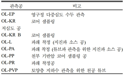 Vaittinen et al.(2019)에 의하면 핀란드의 Posiva Oy는 앞서 4.2절에서 언급한 모든 종류의 관측정을 운영하고 있다(Table 1, Fig. 9). 그림에 제시된 바와 같이 설치된 각 관측정의 설계는 기본적으로는 관측정의 최종 목표 심도에 따라 다르게 진행되었음을 알 수 있다. Fig. 9에 보이는 관측정 타입 중 폐기물 처분장 공동과 관련하여 균열암반 매질에서의 심도별 지하수위 및 유동 관측을 목적으로 하는 관정은 EP와 KR로 표시되는 관정들로 각각 다중완결구조와 나공 내 다중패커를 이용하는 구조로 이루어져 있다. 각 관정의 착정 방법과 심도에 관한 설계 개념은 Table 1에 제시된 바와 같다. 이중 OL-KR의 다중패커를 이용한 관측정의 경우 상황에 따라 관측심도를 변경하기도 한다.