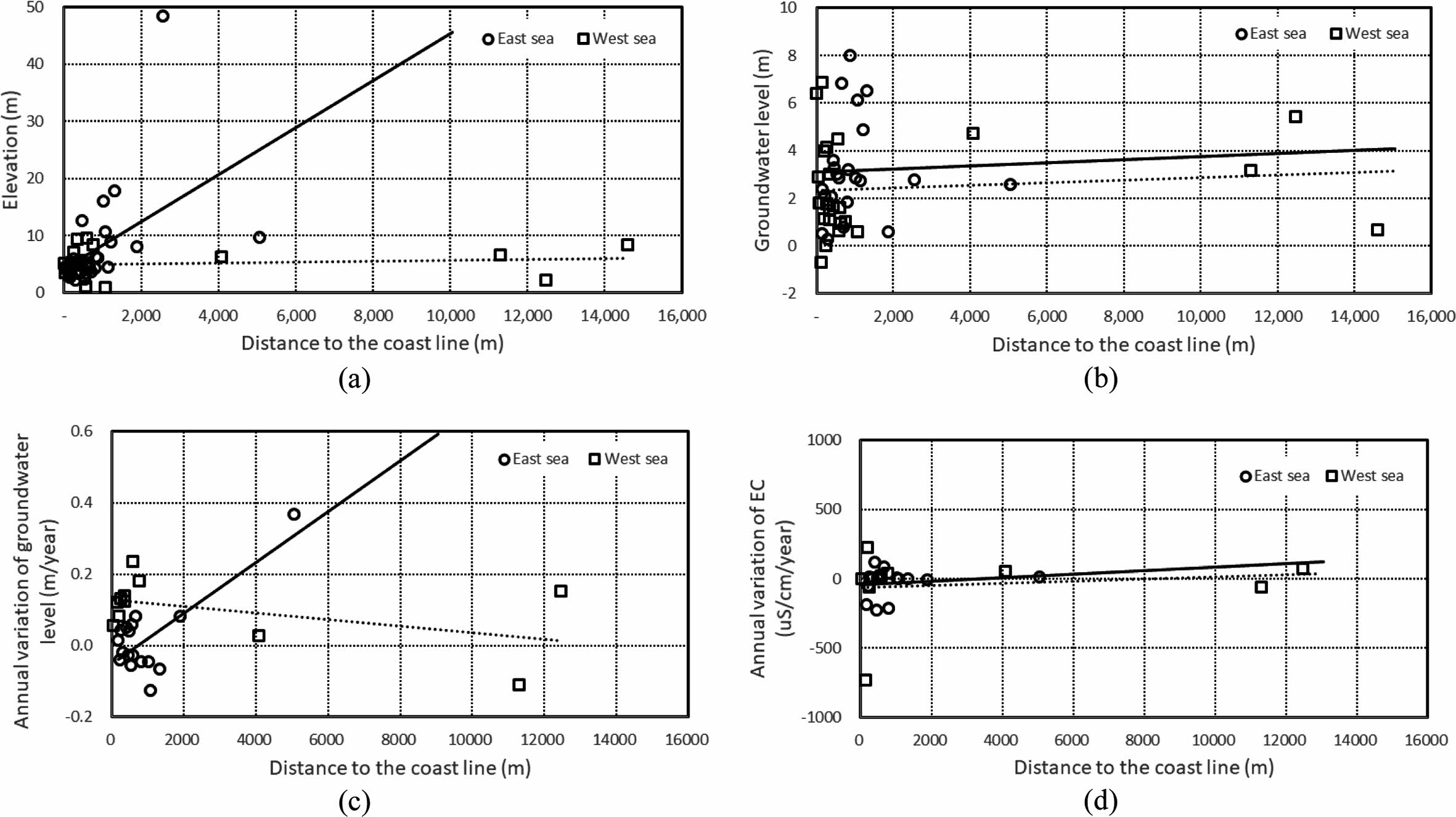 Fig. 6 Distribution of elevation (a), groundwater level (b), annual variation of groundwater level (c), and annual variation of EC (d) with distance to the coast line for the analyzed wells (2018∼2024). Solid lines and dotted lines indicate the trend lines of data for East Sea and West Sea, respectively. |