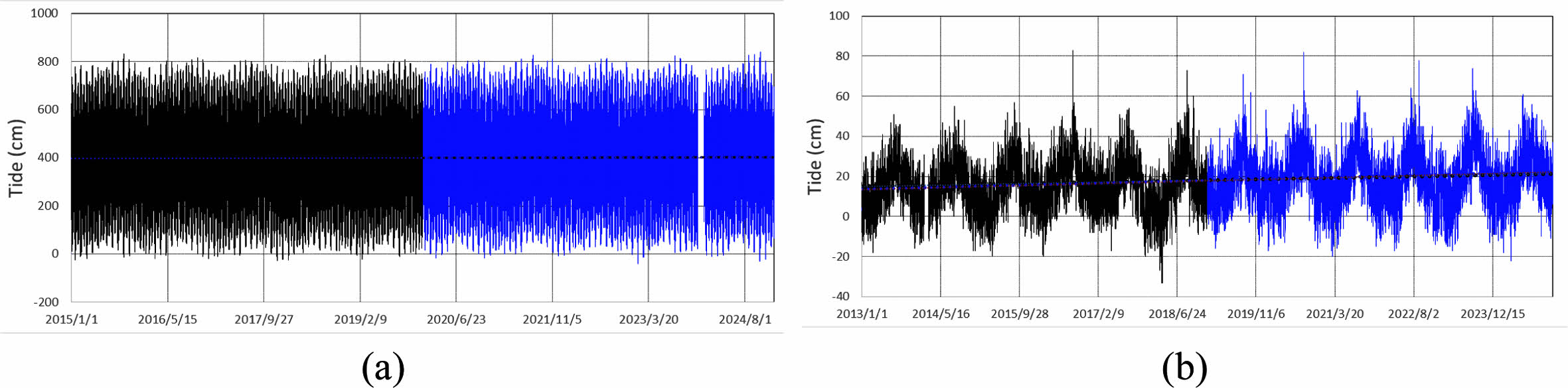 Fig. 8 Tidal variation at Taean (a) and Donghae-hang (b) gauging station. |