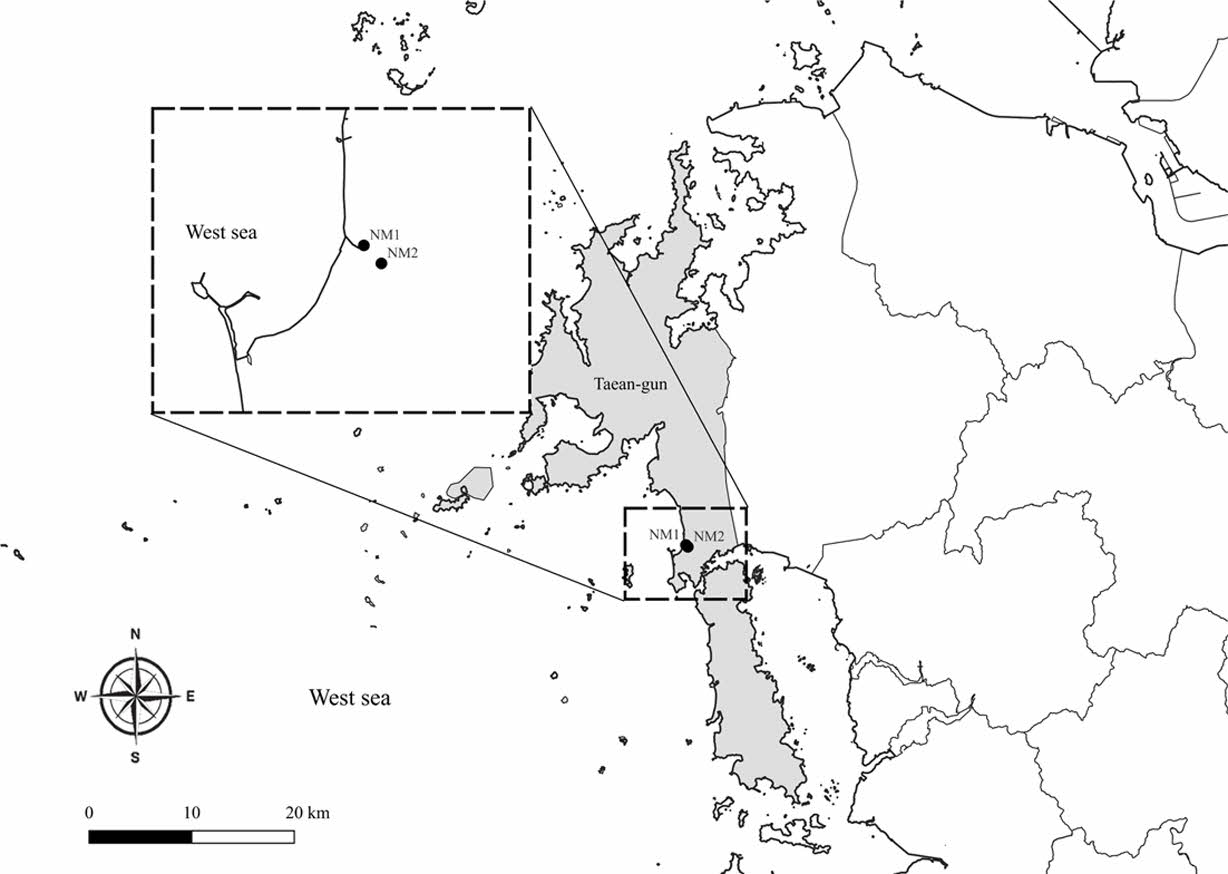 이 유역은 태안반도 서쪽의 지형경사가 완만한 지역으로, 관측공은 2014년에 해안선과 수직 방향으로 2공(NM1, NM2)을 설치하여 운영 중이다. NM1과 NM2 관측공의 해안선까지의 거리는 각각 205 m와 452 m, 해발고도는 각각 1.67 m와 1.79 m이다(Fig. 10).