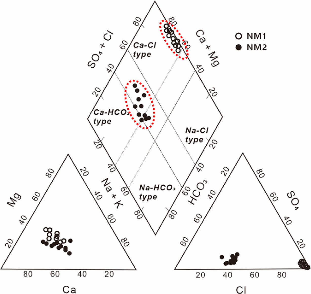 Fig. 11 Piper plots of groundwater chemistry for NM1 and NM2 monitoring wells during 10 years (2015-2024). Dotted areas indicate well group for 2 monitoring wells. |
