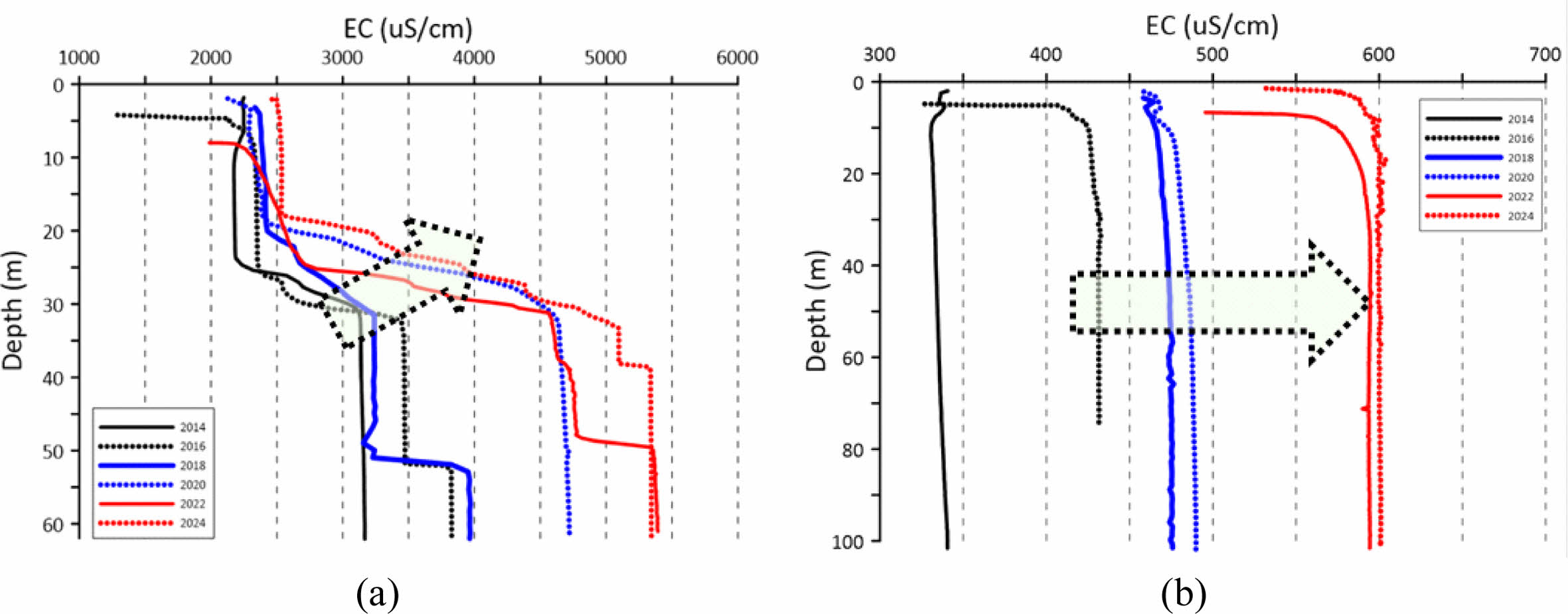 Fig. 15 Electrical conductivity profiling at GD2 (a) and GD3 (b) monitoring wells during 12 years (2013-2024). Dotted arrows indicate the movement of transition zone between saline groundwater regime and fresh groundwater regime. |