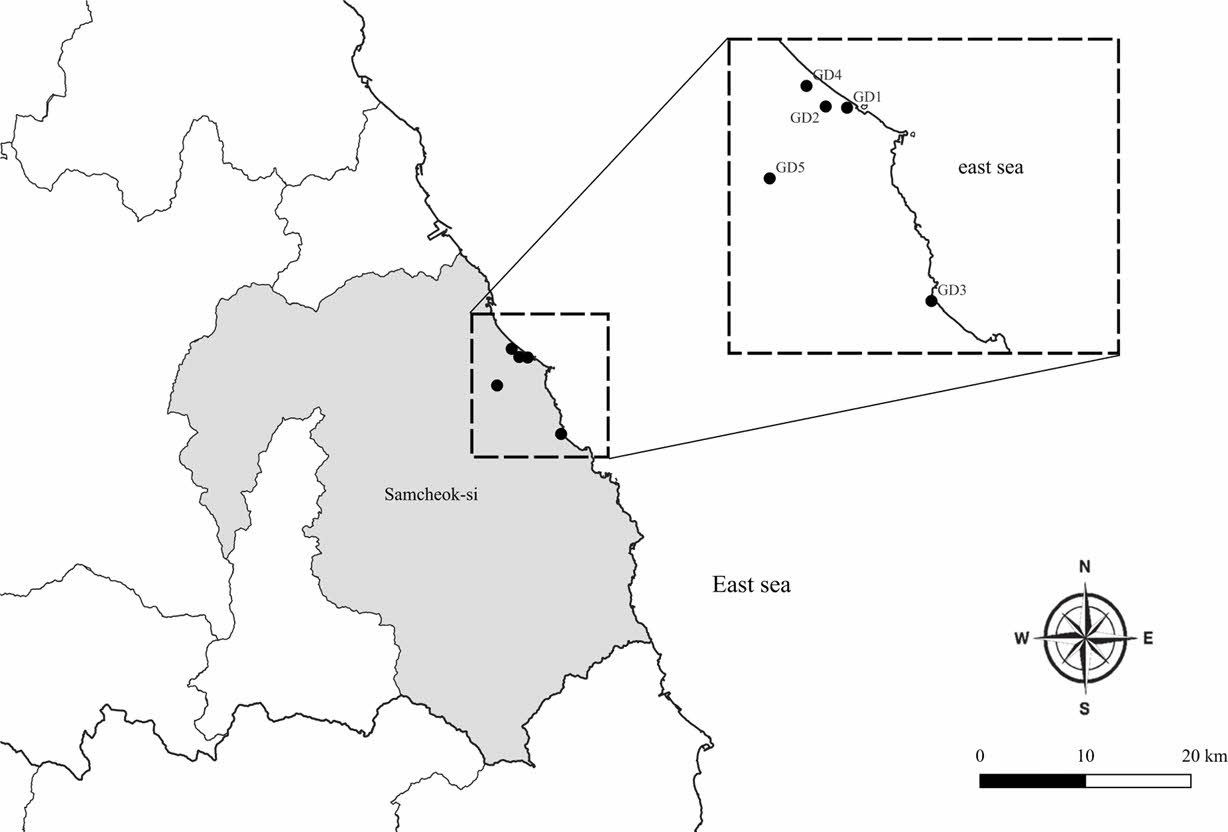 이 유역은 동해안의 지형경사가 큰 지역의 해안변에 위치하며, 관측공은 2012~2023년에 해안선과 수직 방향을 포함하여 총 5공(GD1~GD5)의 관측공을 설치하여 운영 중이다. 관측공들의 위치는 GD1, GD2, GD4가 인접하며, GD5는 유역의 상류부에 위치한다. GD3은 남쪽의 다른 유역의 해안변에 위치하고 있다. GD1~GD5 관측공으로부터 해안선까지의 거리는 각각 312 m, 715 m, 186 m, 546 m, 4,113 m이며, 해발고도는 각각 2.20 m, 3.70 m, 2.60 m, 9.00 m, 2.20 m, 72.20 m이다(Fig. 13).