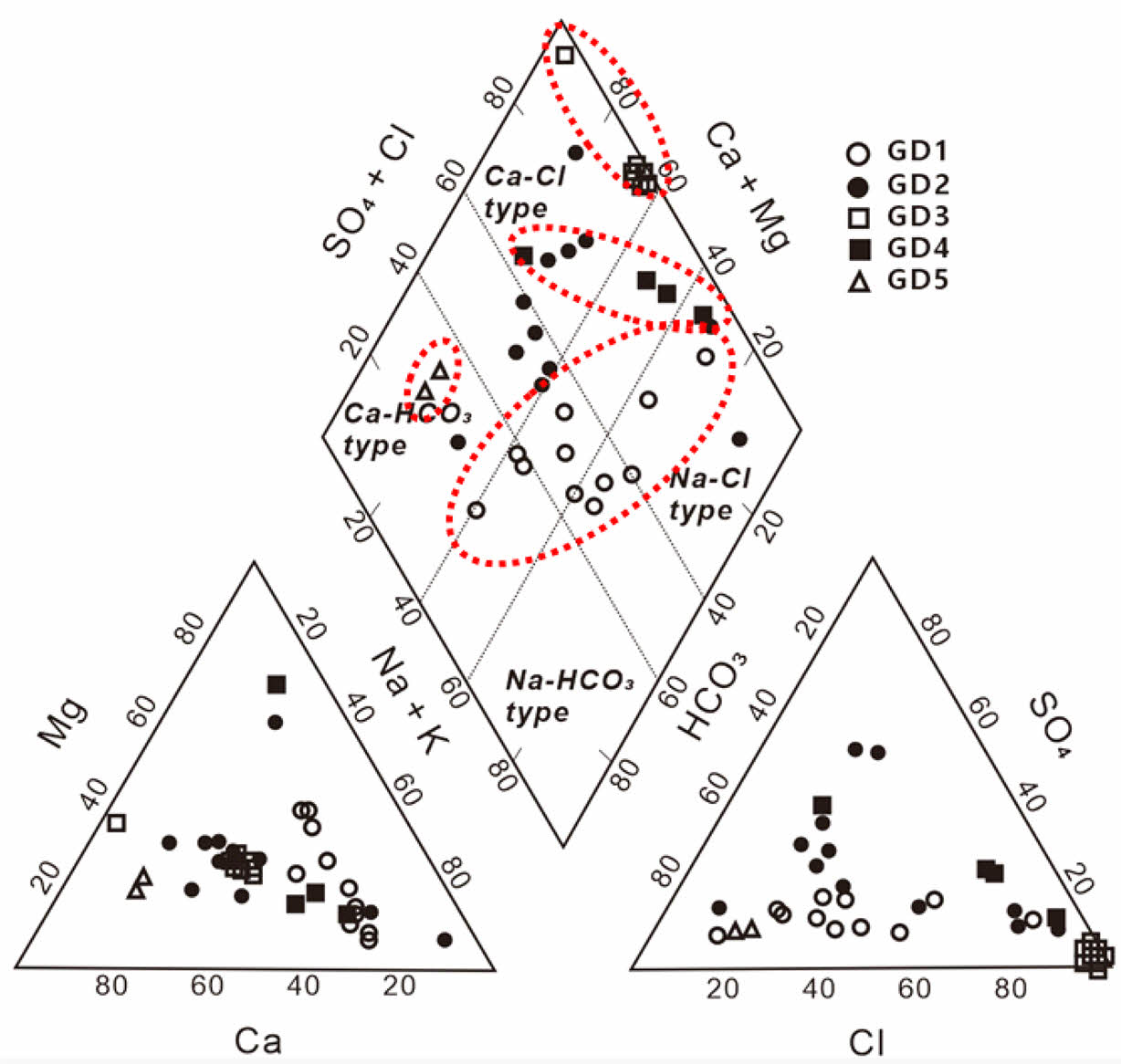 Fig. 14 Piper plots of groundwater chemistry for GD1~GD5 monitoring wells during 12 years (2013-2024). Dotted areas indicate well group for 5 monitoring wells |
