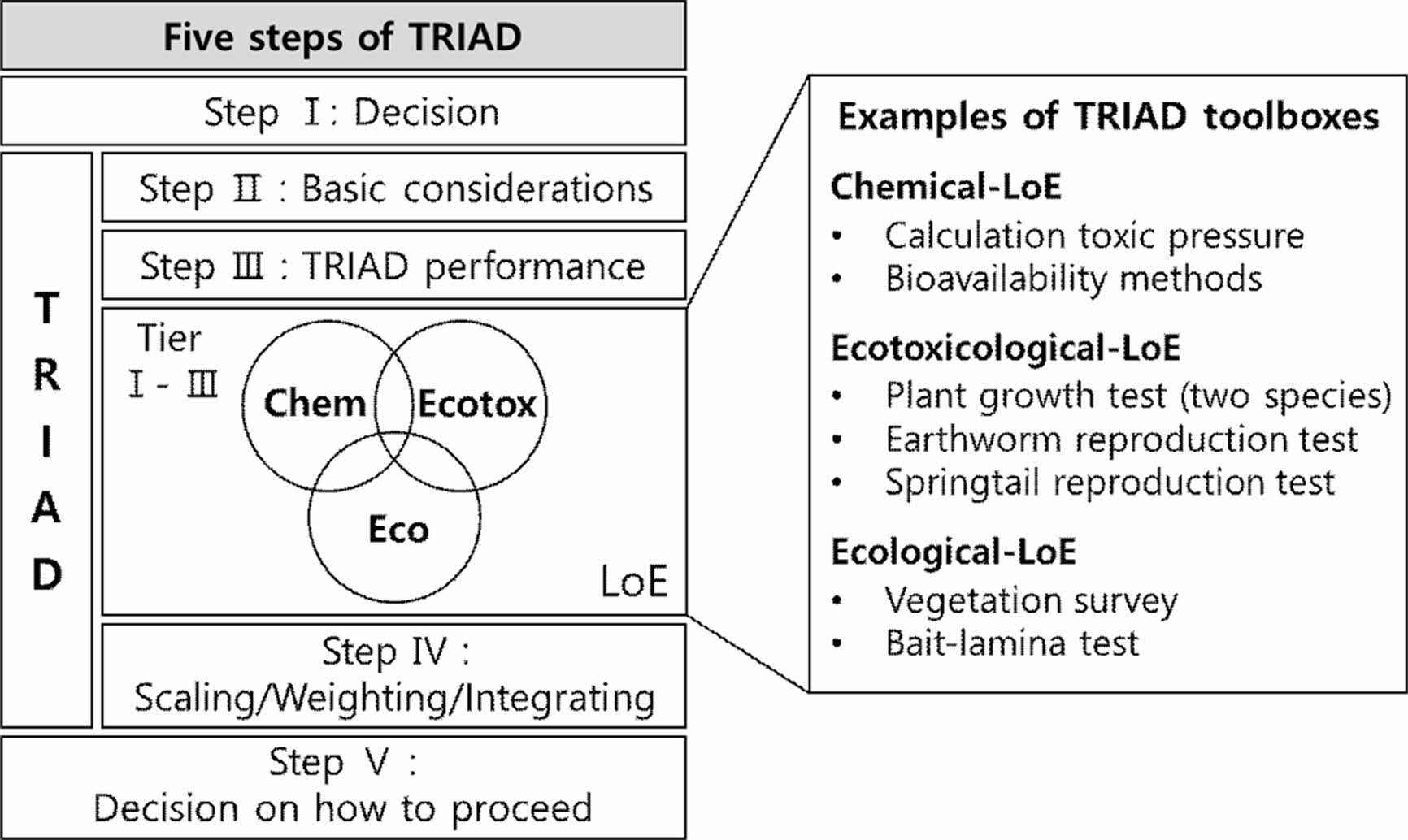 TRIAD를 적용한 사례는 부지이력에 따라 크게 폐광부지, 산업부지, 기타부지로 분류 가능하다. 대부분의 대상부지는 한가지의 오염물질이 명확하게 밝혀지지 않음에 따라 기본적인 토양 이화학분석과 함께 토양 내 금속의 총농도 분석을 수행하였다. TRIAD 평가 방법을 적용한 사례는 모두 Chem-LoE를 산정하였는데, 토양 내 금속총농도 이외에 추출 가능한 금속 농도 분석을 수행한 경우 지렁이 체내 금속 축적량을 평가하였다(Antunes, 2008; Hong, 2021). Ecotox-LoE 평가 또한 실험적 문제로 제외된 1건의 사례(Volchko, 2020)를 제외하고 모두 산정된 것으로 확인되었다. Eco-LoE 평가는 상황에 따라 분석지표에 선택적으로 포함되는 것으로 확인되었다. 한편, 생태학적 지표는 현장의 특성을 나타내는 중요한 요소이므로, TRIAD 평가에서는 반드시 화학, 생태독성학, 생태학적 요인이 필수적으로 수반되어야 할 필요가 있다.