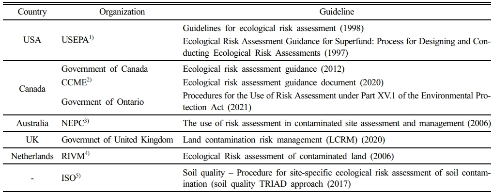 토양은 인간뿐 아니라 육상생물의 주요 서식처로, 안전한 토양환경을 관리하기 위해서는 인체위해성과 생태위해성을 모두 고려하는 위해성평가 기반 관리가 필요하다. 국내의 경우 1995년 토양환경보전법이 제정된 이후, 토양오염 위해성평가 지침이 2006년에 마련되었으나, 인체에 미치는 위해만을 평가하는 등 환경전반에 대한 영향을 평가하지 못하였다(국립환경과학원, 2019). 반면, 국외에서는 인체와 생태를 모두 고려하는 생태위해성평가 기법을 제안하여 활용하고 있으며, 특히 자국 상황에 맞는 토양생태위해성평가를 수행하고 있다. 국외에서 시행 중인 토양생태위해성평가 지침목록은 Table 1과 같다. 미국, 캐나다. 호주, 영국, 네덜란드는 현장에 적용 가능한 생태위해성평가 관리 제도를 수행하고 있으며(USEPA, 1997; USEPA, 1998; CCME, 1999; Government of Canada, 2012; NEPC, 2006, EU, 2003; Environment Agency, 2008), 국제표준화기구 ISO(International Organization of Standardization)는 네덜란드 지침인 「Ecological Risk assessment of contaminated land」(RIVM, 2006)를 기반으로 한 현장 생태위해성평가에 관한 국제 표준안「Soil quality – Procedure for site-specific ecological risk assessment of soil contamination (soil quality TRIAD approach)」 을 발표하였다(ISO, 2017).
