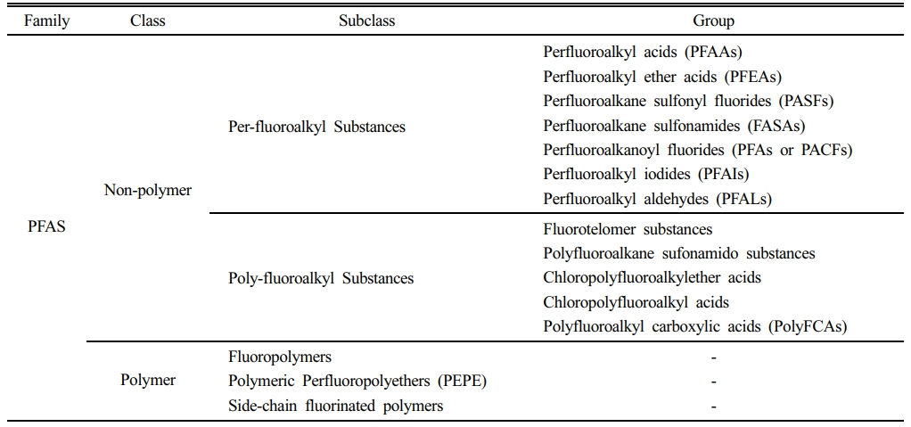 PFAS는 C-F 결합을 하나 이상 포함하는 물질로 정의한다(Schymanski et al., 2023). PFAS는 정의에 따라서 수백만 종의 화합물들이 포함되는 것으로 보이며, 2024년도 EPA에서 Toxic Substances Control Act에 따라 PFAS 13,054종의 사용을 제한하였다(EPA, 2024).