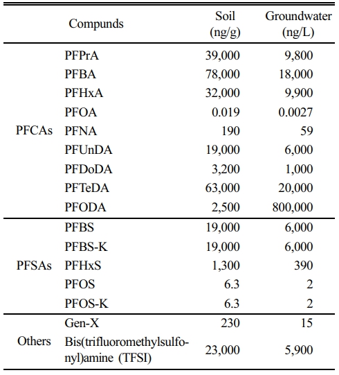 PFAS는 표층수 및 지하수와의 상호작용을 통해 지속적으로 교환되며, 표층 지하수와의 흡·탈착 작용, 강우에 의한 침투, 유기물과의 결합 및 점토광물과의 흡착 등 다양한 작용을 통해 PFAS 농도에 영향을 미친다(Wang et al., 2022). 또한, 지하수의 수문학적 특성에 따라 PFAS는 상부 대수층에서 하부 대수층으로 이동하거나 반대로 유출되기도 하며, 이는 장기적인 확산 및 축적 문제를 초래한다(Loganathan and Wilson, 2022; Zhang et al., 2016). PFAS 오염은 단기간에 해결되기 어려운 복합적인 문제로, 토양과 지하수의 관리를 통한 장기적이고 선제적인 대응 전략을 마련할 필요가 있다.