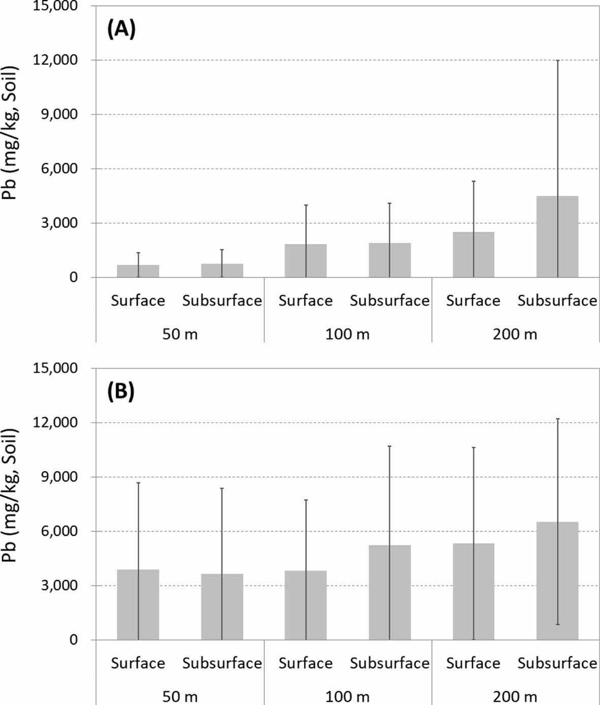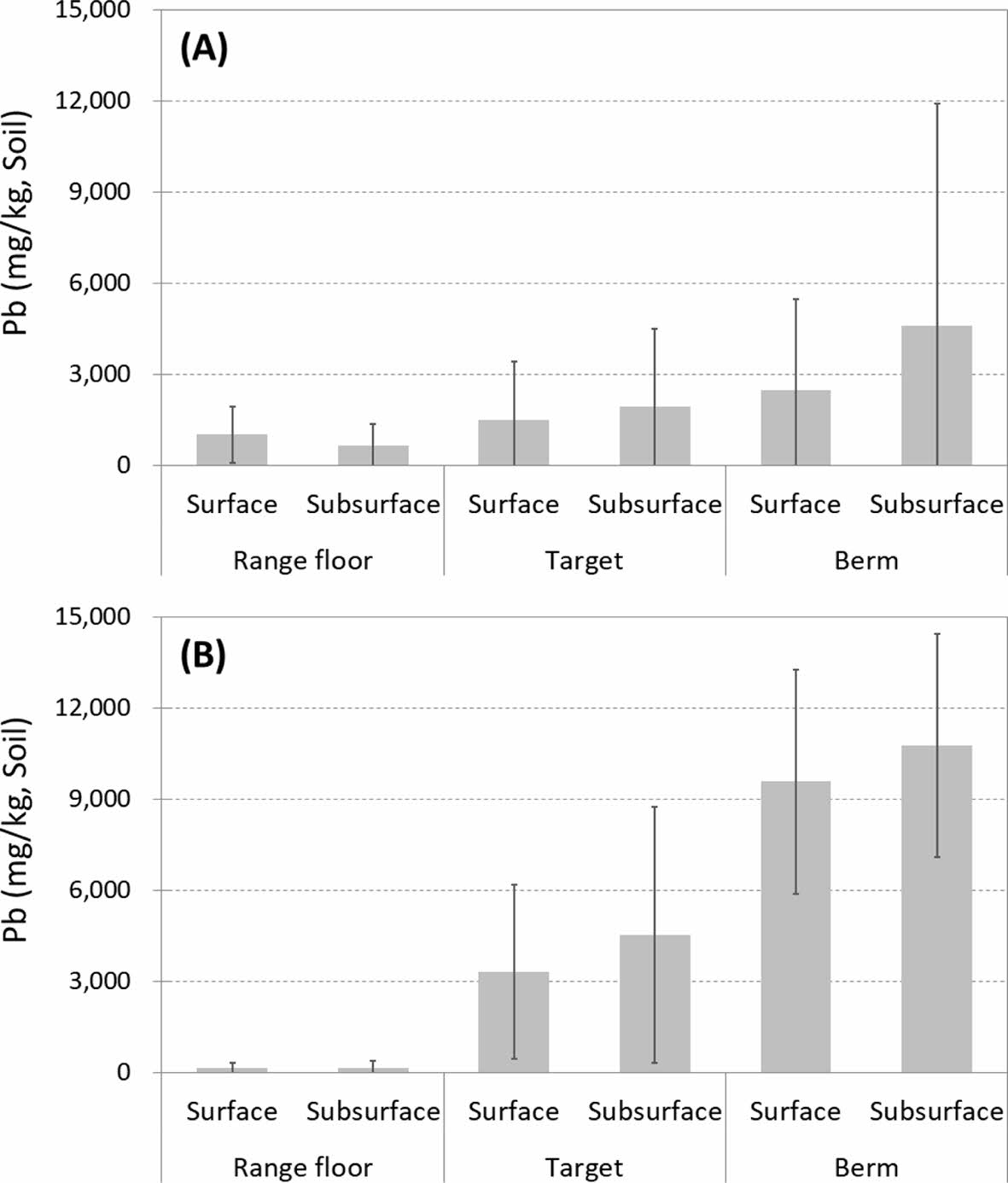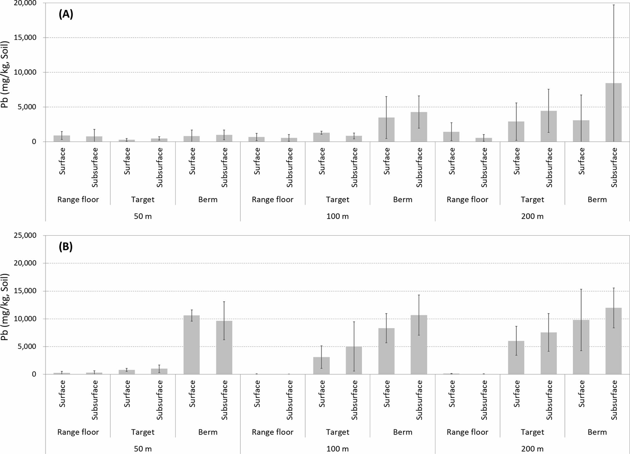 Fig. 5 Pb concentration of soils in the shooting ranges (A: Shooting range in Gangwon province; B: Shooting range in Gyeonggi province). |