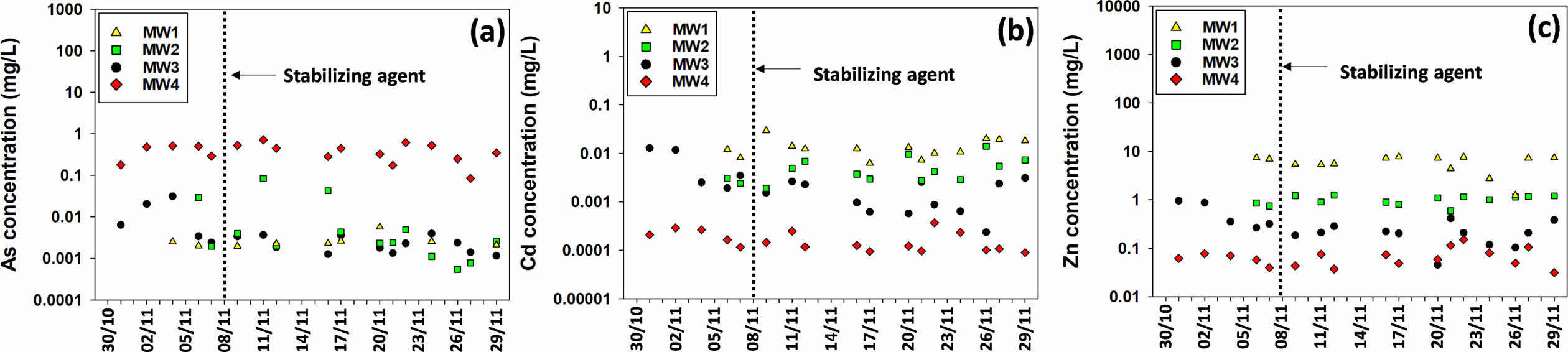 Fig. 3 Time-series variations of dissolved metal concentrations before and after stabilizing agent injection: (a) As, (b) Cd, and (c) Zn. Symbols denote monitoring wells. (MW1: yellow triangle, MW2: green square, MW3: black circle, and MW4: red rhombus). The vertical dashed line marks completion of the stabilizing agent injection. Concentrations are plotted on a logarithmic scale. |