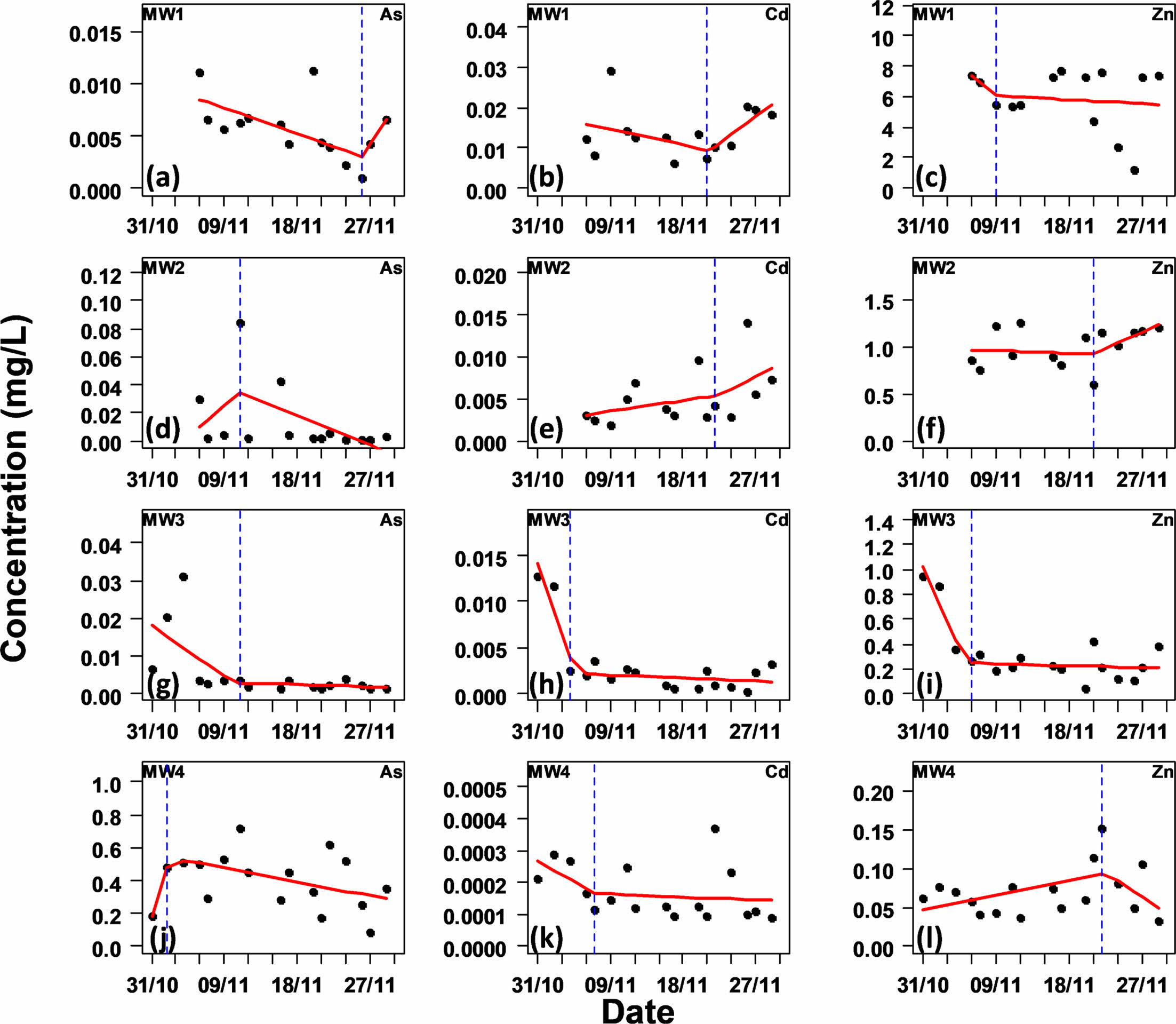 Fig. 4 Segmented regression of metal concentrations measured by DGT. Each panel presents the temporal trends of As, Cd, and Zn for monitoring wells MW1, MW2, MW3 and MW4. Black dots represent observed concentrations, red solid lines indicate fitted segmented regression lines, and blue dashed lines mark the estimated change points. |