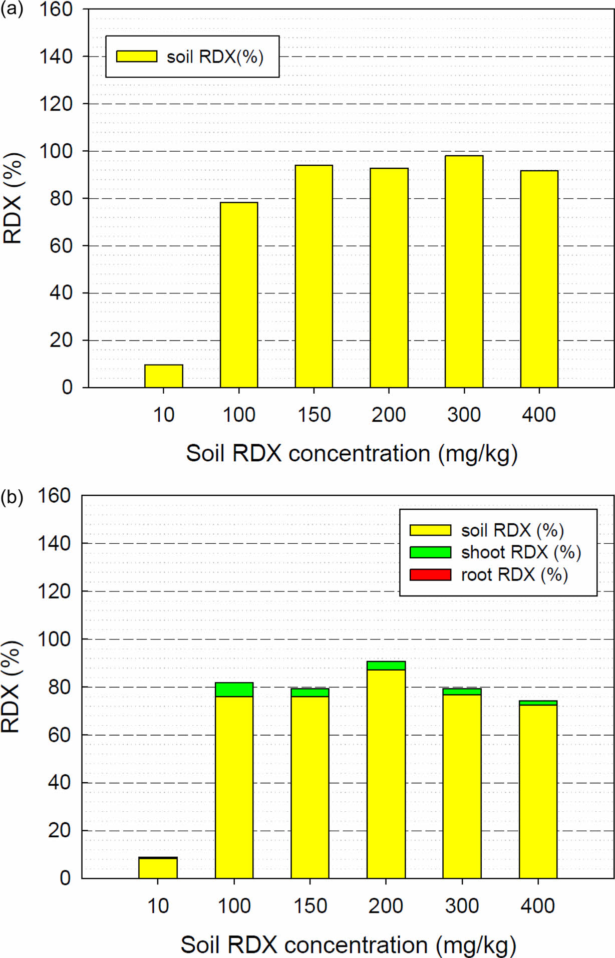 군사격장은 대부분 오지에 위치하여 동력원을 설치하기 어려운 반면, 부지가 넓어 식물상 정화공법와 같은 친환경적 정화법을 적용하기에 적합하다. 다수의 연구에 의하면 갈풀을 포함한 9종의 정수 및 수생식물(Best et al., 1997), 옥수수, 콩, 빨간 무, 상추, 토마토 등의 작물(Cataldo et al., 1990; Larson, 1997), 밀과 벼(Vila et al., 2007a)와 같은 곡물, 호밀풀 및 토끼풀을 포함하는 많은 수의 초본식물(Rocheleau et al., 2008; Winfield et al., 2004)과 목본인 포플라(Thompson et al., 1999)도 토양에서 RDX를 흡수/분해하였다. 식물이 흡수한 RDX는 곧바로 잎과 줄기를 포함하는 지상부로 이송되는데, 식물종에 따라 60% (Thompson et al., 1999) 혹은 80% 이상(Vila et al., 2007b)이 지상부에서 검출되었다. 지상부에서는 식물 효소에 의한 분해와 광분해가 동시에 발생하여 RDX보다 극성이며, 분자량이 300배 이상이 되는 전환산물이 생성되었다(Larson et al., 1999; Just and Schnoor, 2004). Hagan et al.(2016)은 16종의 속씨식물을 RDX 오염토양(농도 100, 500 및 1000 mg/kg)에 파종하여 75일간 재배하였다. 그 결과 16종의 식물에서 생장 저해가 관측되었고, 2종의 식물에서는 오히려 생장이 증진되었다. 특히 콩과식물인 왕관칼퀴나물(Coronilla varia)은 잎에 최대 36 mg/plant의 RDX를 축적하였다.