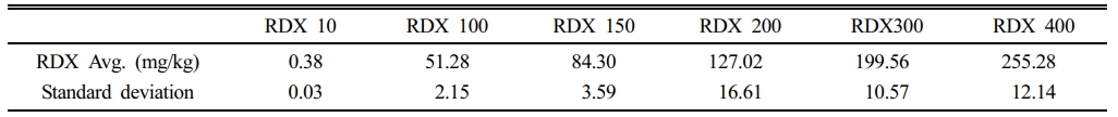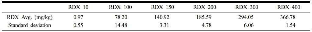 RDX 및 전환산물인 MNX(mononitroso-RDX), DNX (Dinitroso-RDX) 및 TNX(Trinitro-RDX)는 HPLC-UV로 분석하였다. HPLC는 Varian ProStar 소프트웨어를 사용하였고, 분석칼럼은 Shiseido CAPCELL PAK RP C-18 column(4.6 × 250 mm, 5 um)이며, 유량 0.8 mL/min(Water : Methanol = 45 : 55), UV 230 nm, 40℃의 조건으로 운영하였다. 추출한 시료는 2회 분석하고 그 평균값을 사용하였다. 미량 RDX 농도 7회 분석으로 산정한 HPLC 검출한계는 3 mg/L, 정량한계는 31 mg/L이었다.