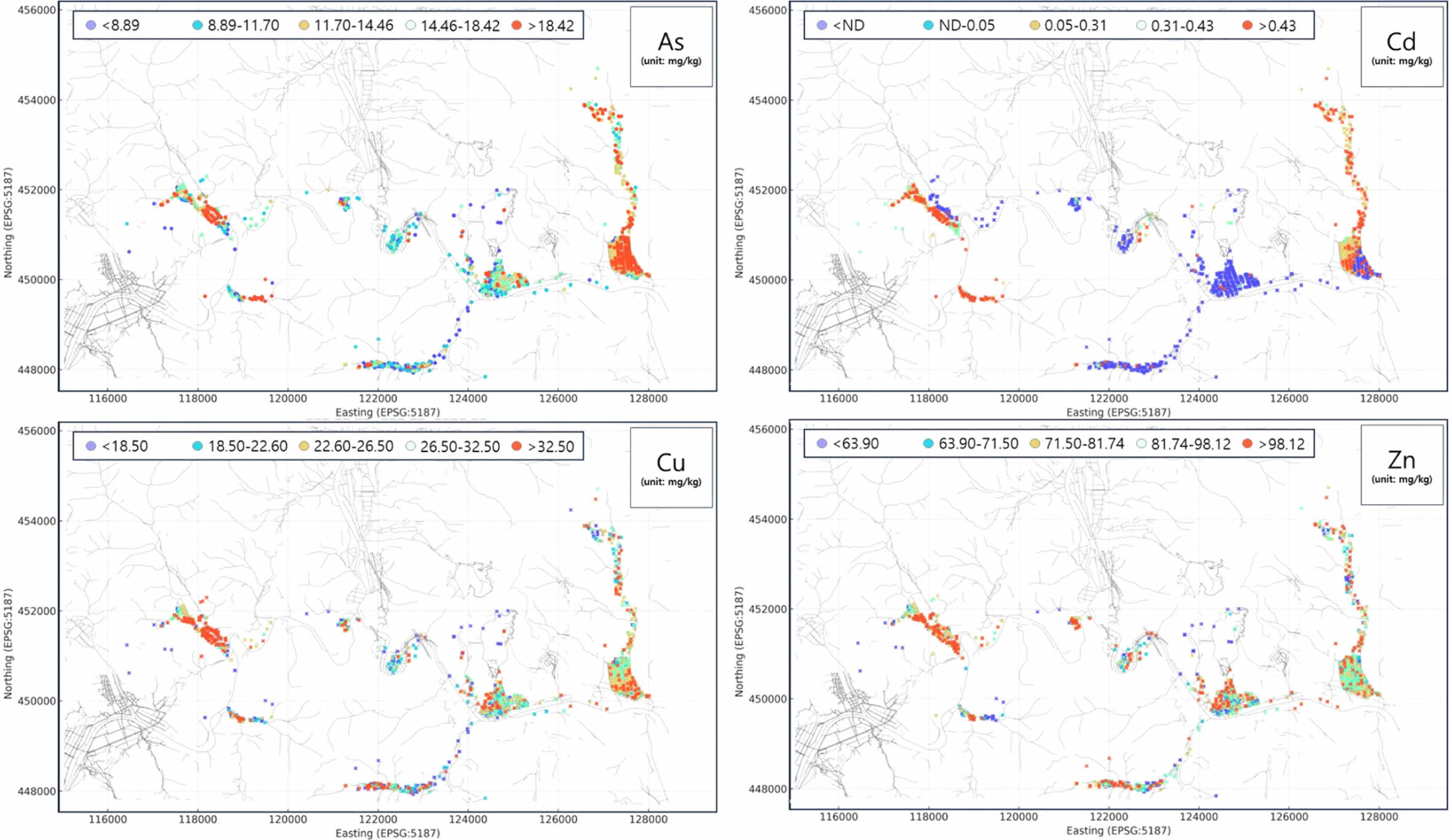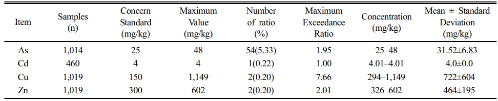 본 연구는 논(답) 토양 총 1,019점에 대해 분석하였으며, 우려 기준은 1지역 기준을 적용하였다. As는 대부분 지역에 기준을 초과하였으며, Cd과 Cu 및 Zn는 일부 지역에서 집중적으로 오염이 확인되었다(Talble 6)(Fig. 2).