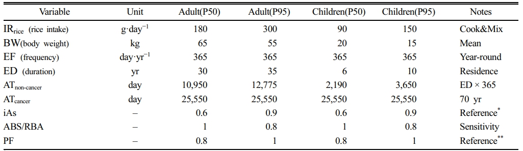 여기서 Crice는 쌀을 통한 섭취 농도, IR은 식이섭취량(kg/day), BW는 체중(kg)이었다.