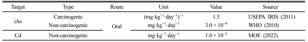 비발암 위해성 평가는 참고용량(RfD, Reference Dose)을 기준으로 하고 발암 위해성 평가는 발암잠재력(CSF, iAs 한정)을 이용하여 산정하였으며, 참고용량은 Table 3과 같았다.