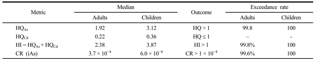 결정론적 평가는 표토 농도와 pH 자료가 있는 ‘답(논)’ 지점만을 대상으로 동일 지점군(n = 455)에 대해 성인과 어린이 각각 중앙값(P50)으로 산정하였다. 전체 중앙값 기준으로 성인의 결과는 HI는 2.38, CR(iAs)은 3.7 × 10-4 였으며, 지점 초과비율(P50 기준)은 HI > 1이 99.8%, CR > 1 × 10⁻4가 99.6%였다. 어린이는 체중이 낮고 섭취량의 체중 보정 효과가 커서 ADD가 증가하므로, 동일 지점 군과 동일 쌀 농도 가정에서 중앙값 기준 HI와 CR이 성인보다 더 크게 산출되었다. 어린이의 경우 HI는 3.87, CR(iAs)은 6.0 × 10-4로 지점 초과비율(P50 기준)은 HI > 1 및 CR > 1 × 10⁻4 모두 초과하였다(Table 7).
