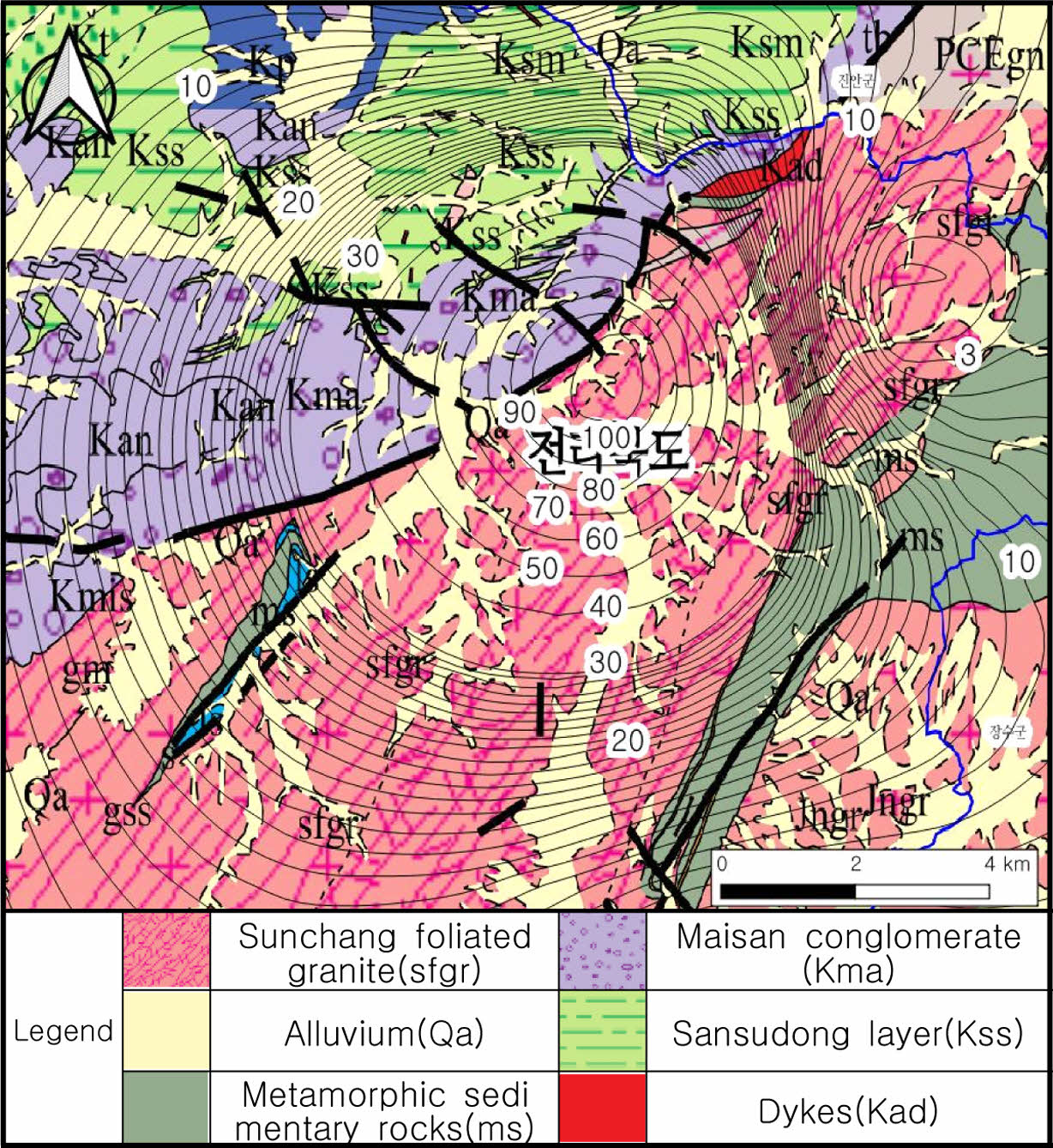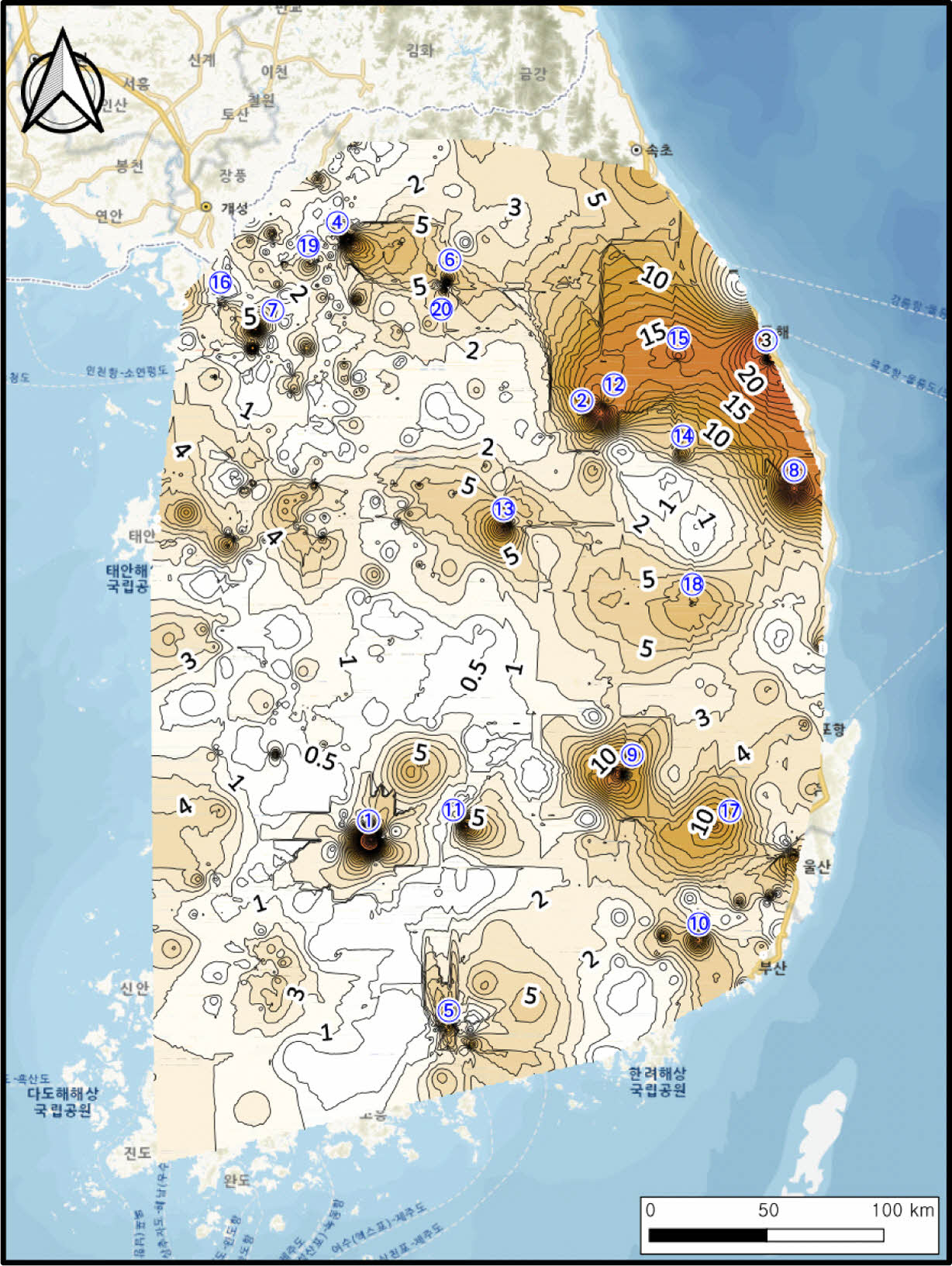 비소농도별 지질 및 지층분석은 지질정보시스템(https://data.kigam.re.kr/)에 제시된 전국 5만 수치 지질도를 이용하여 비소 등농도곡선과 중첩하였다(Fig. 3). 중첩된 지질도를 이용하여 해당지역의 지층을 추출하였으며, 지질정보는 비소농도가 높은 상위 20개 지역에 대하여 지층 및 대표 암질을 Table 2에 나타내었다.