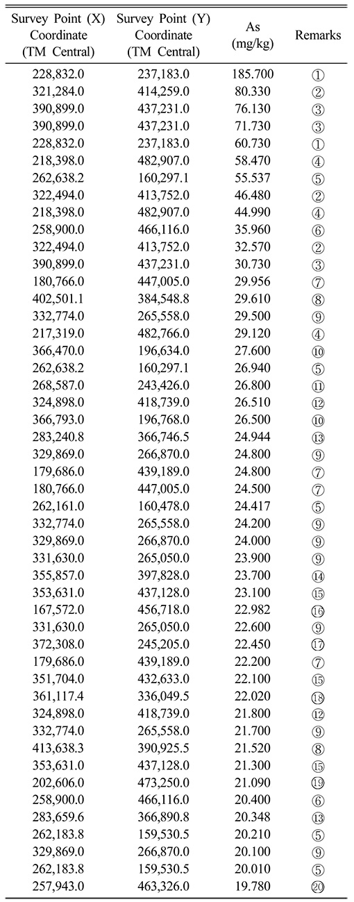 Table 1은 조사지점 중 비소농도가 높은 지역 순으로 정리한 것이며 비소농도가 높은 20개 지역을 연구대상지역으로 선정하였다.