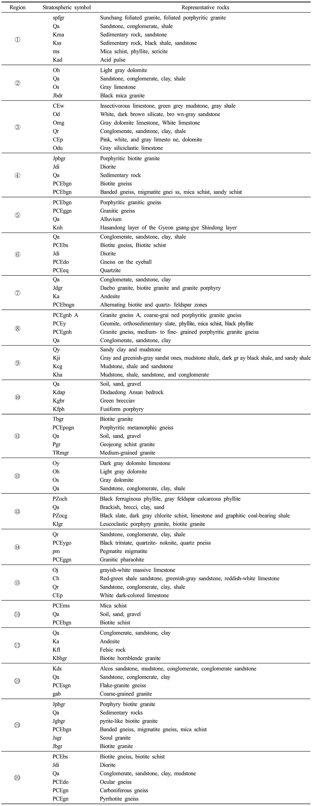 상위 5개 지역을 포함하여 비소농도가 높은 20개 지역의 지층 및 대표암석을 분석하여 Table 2에 제시하였다. 비소농도가 높은 상위 5개 지역은 총 24개 지층 중 석회암층 7개 지층, 화강암층 5개 지층, 충적층 5개 지층, 편마암층 2개 지층, 퇴적암층 2개 지층, 기타 3개 지층으로 분석되었으며 석회암층 및 화강암층이 전체의 50%를 차지하는 것을 알 수 있다. 20개 지역의 총 89개 지층을 분석한 결과 화강암층은 21개 지층, 충적층 및 신기하성층은 20개 지층, 석회암층은 15개 지층, 편마암층은 11개 지층, 퇴적암류 2개 지층과 기타 20개 지층으로 나타나 화강암층 23.6%, 석회암층 16.8%, 충적층 및 신기하성층 22.5%로 화강암층 및 석회암층이 전체의 40.4%로 높은 비율을 보여주고 있다. 또한 충적층 및 신기하성층은 22.5%로 많은 지역에서 지층이 분포되어 있으나 대부분 타 지층사이에 사암이나 역암, 셰일 등으로 인입되어 있는 형태임을 확인할 수 있다.