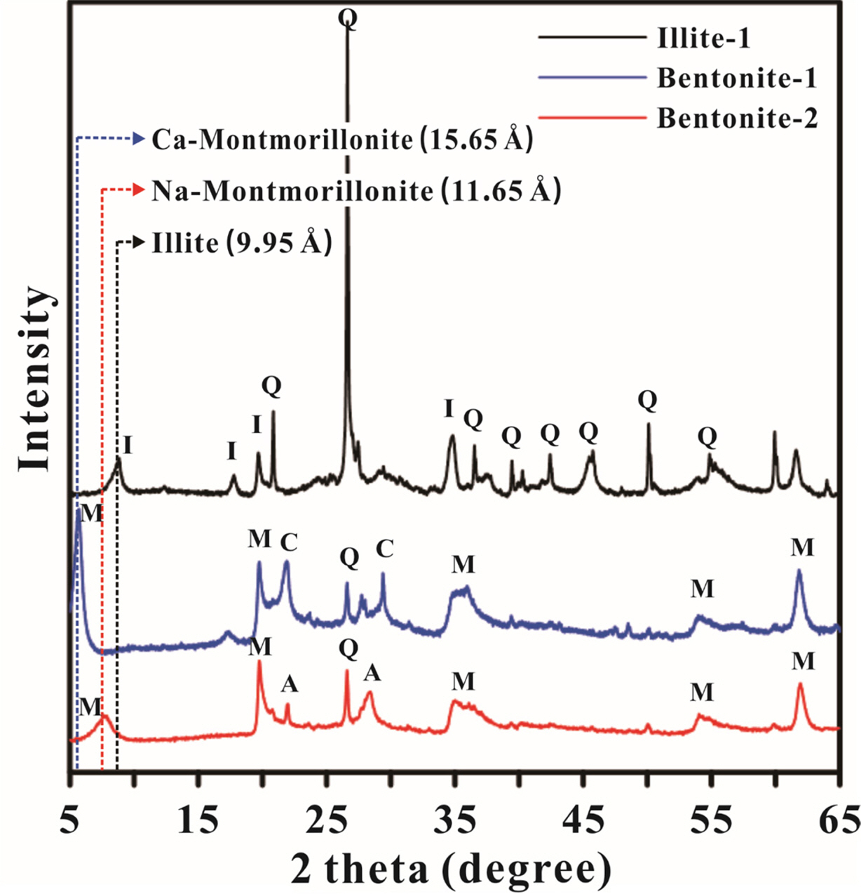 Fig. 1 XRD characterization of Illite-1, Bentonite-1, and Bentonite-2 (I : illite, Q : quartz, M : montmorillonite, C : calcite, A : albite). |