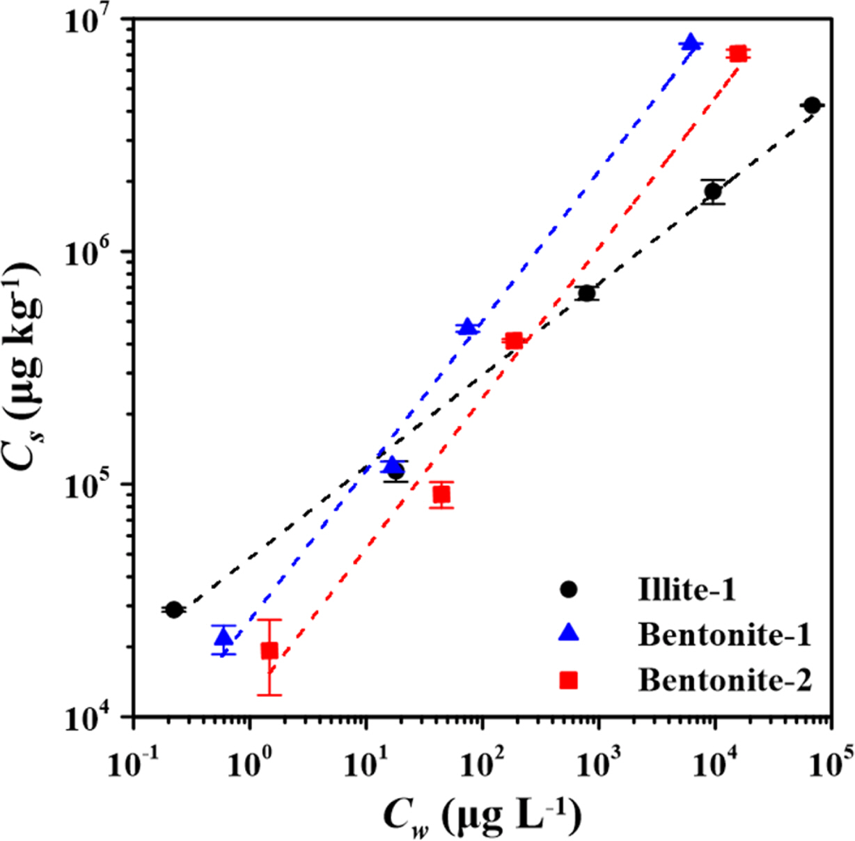 Fig. 2 Cs sorption isotherms for Bentonite-1, Bentonite-2, and Illite-1. Symbols represented the experimental data, and the two standard deviations were displayed on the error bar. The solid and dotted lines showed the results of the Freundlich model, respectively |