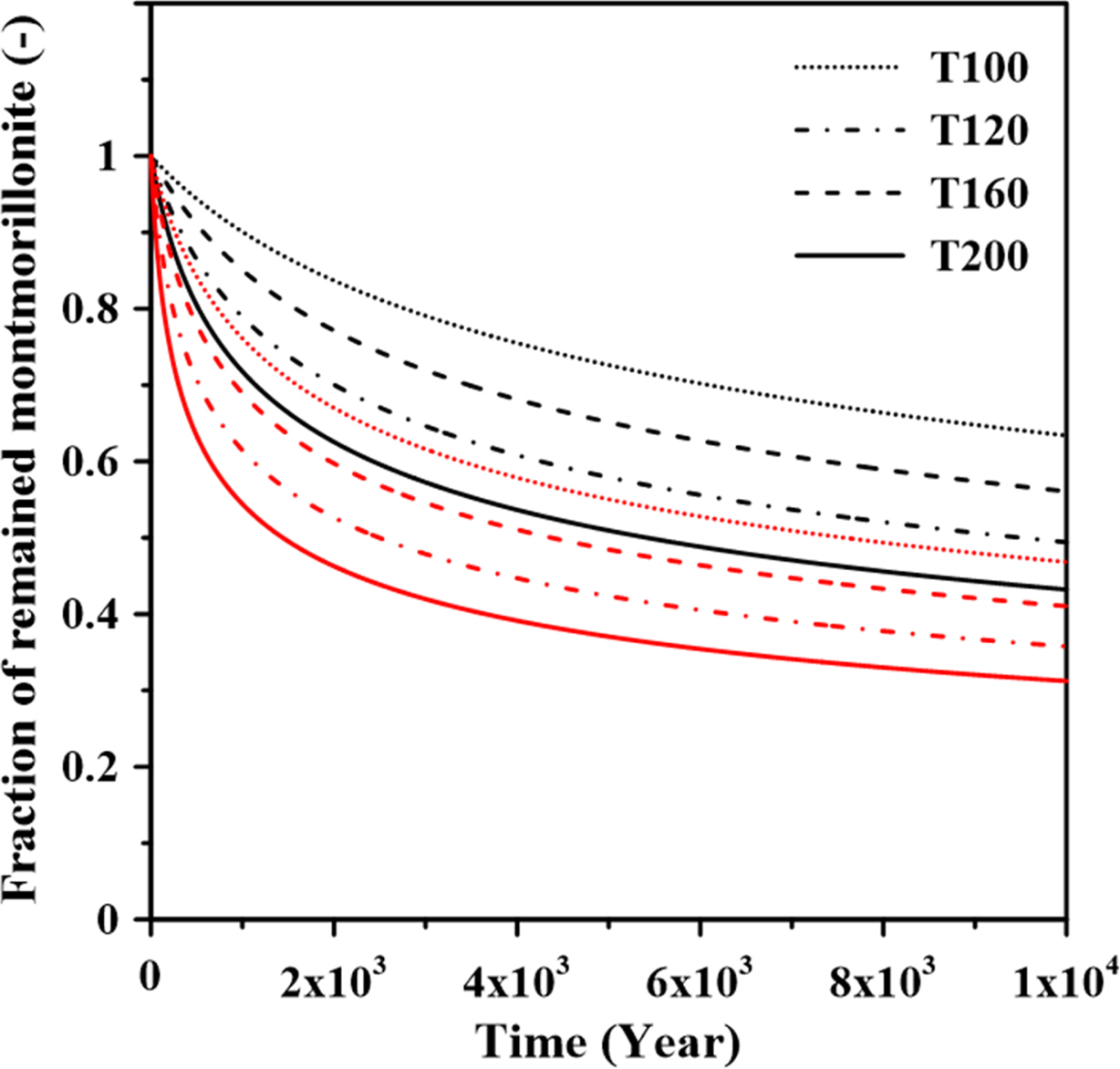 Fig. 3 Montmorillonite-illite conversion fraction (-) as a function of time (day) for a maximum temperature of 100oC, 120oC, 160oC, and 200oC. Black and red lines represented the results when the potassium concentration is 2×10-5mol L-1 and 1.7×10-3 mol L–1, respectively. |