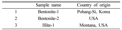 국내외에서 산출되는 2종류의 벤토나이트와 1종류의 일라이트를 이용하여 연구를 수행하였다(Table 1). 벤토나이트-1은 우리나라 포항 일대에서 채취하여 분쇄처리한 시료이며, 벤토나이트-2는 Sigma-Aldrich에서 판매하는 벤토나이트(https://www.sigmaaldrich.com/)이다. 벤토나이트와의 비교를 위한 일라이트는 미국 몬타나 주에서 생산되는 일라이트를 ‘The Clay Minerals Society’(http://www.clays. org/)에서 구매하였다. 모든 점토 시료들은 체질을 통해서 입도 별로 나눈 후, 시중에 많이 유통되는 규격인 45–53 μm 크기의 입도를 선정하여 물리·화학적 특성을 분석하고 Cs 수착 실험을 수행하였다.