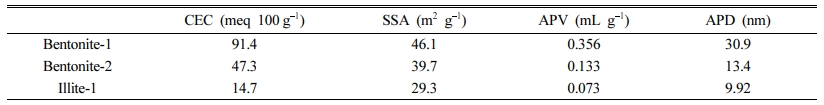 점토 시료의 수착 성능과 연관될 것으로 추정되는 양이온 교환능(cation exchange capacity [CEC])은 아세트산-암모늄 방법(ammonium acetate method)을 이용하여 측정하였으며, 이 때, 암모늄 이온의 농도는 단백질/질소 자동분석기(Kjeltec auto 2400/8400 System, FOSS Tecator AB, Hoganas, Sweden)를 사용하여 분석하였다. 마지막으로 점토 시료의 비표면적(specific surface area [SSA])과 평균 공극 부피(average pore volume [APV]), 평균 공극 직경(average pore diameter [APD])을 비표면적-공극 분석기(ASIQM0000-4, Quantachrome, Boynton Beach, FL, USA)를 사용하여 측정하고, BET(Brunauer-Emmett-Teller), BJH(Barrett-Joyner-Halenda) 방법을 이용하여 구하였다.