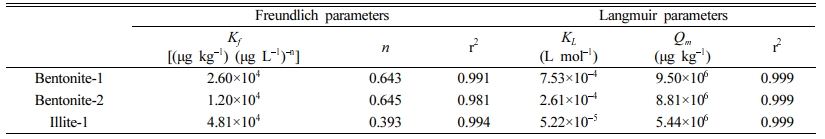 초기 Cs 농도(Ci, μg L–1)와 평형 Cs 농도(Cw, μg L–1)의 차이를 이용하여 시료에 수착된 Cs의 농도(Cs, μg kg–1)을 계산하였으며, 농도별 수착 결과를 취합하여 수착 등온선(sorption isotherm)을 구하였다. 이후, 점토 시료의 수착 특성을 규명하기 위해서 비선형 수착 모델인 프로인들리히(Freundlich)와 랭뮈어(Langmuir) 모델을 각각 적용하였다(Limousin et al., 2007). 프로인들리히 모델(Cs = Kf ×Cwn)에서 Kf ([μg kg–1]/[μg L–1]n)와 n(–)은 각각 수착 친화도와 시료 표면의 불균질성(n=1에 가까워질수록 균질한 표면)을 의미하며, 랭뮈어 모델(Cs = Qm×KL×Cw/[1+ KL×Cw)에서 Qm은 단일 평면 최대 수착량(μg kg–1), KL(L mol–1)은 시료 표면에서의 수착 친화도를 지시한다.