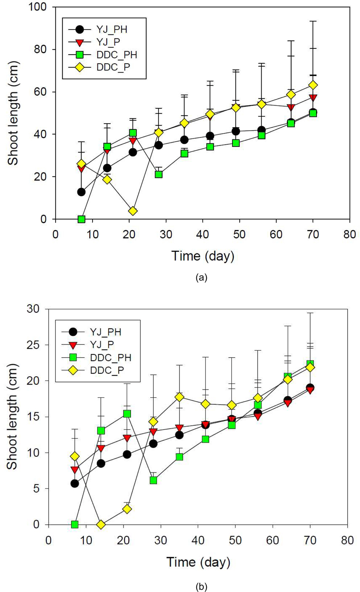 처리토에 파종한 녹비식물 발아율은 50% 미만이었고, 발아한 유식물도 생장이 멈추는 경우가 있어 재파종이 필요했다. 특히 DDC토양에 파종한 식물은 발아 후 유식물이 시들어서, 헤어리베치는 실험 시작 후 21일, 세스바니아는 14일에 각각 재파종하였다. 화분에 재배한 식물의 지상부 평균길이를 비교하면 Fig. 1과 같다. 헤어리베치는 두 종류의 토양 모두에서 HS를 첨가하지 않은 포트에서 길이성장이 더 활발하였다. 세스바니아도 YJ토양에서는 50일경까지, DDC토양에서는 약 58일경까지 HS를 첨가하지 않은 토양에서 식물 지상부 길이가 더 길었으나 70일 경에는 평균길이에서 차이가 없었다. 그러나 헤어리베치는 줄기가 덩굴이어서 측정이 어려웠고 편차가 심해 길이성장이 통계적으로 유의하지 않았다(p>0.05). 세스바니아는 중간에 시들어 재파종한 개체로 인해 편차가 컸고, 헤어리베치와 동일하게 길이성장이 통계적으로 유의하지 않았다(p>0.05).