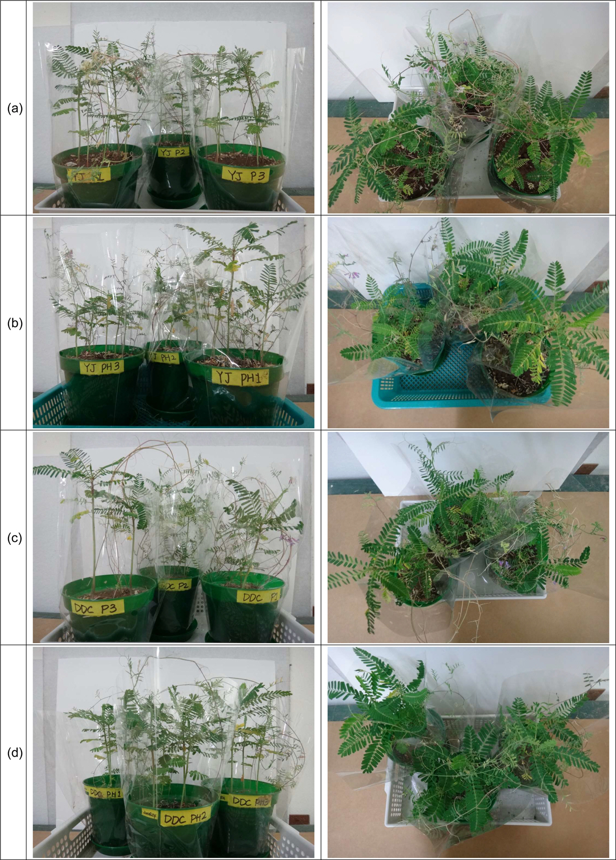 Fig. 2 Photographs of hairy vetch and sesban mixed-planted in the reclaimed soil with or without HA amendment. (a) YJ_P, (b) YJ_PH, (c) DDC_P, (d) DDC_PH. Photographs were taken at Day 79 of cultivation. |