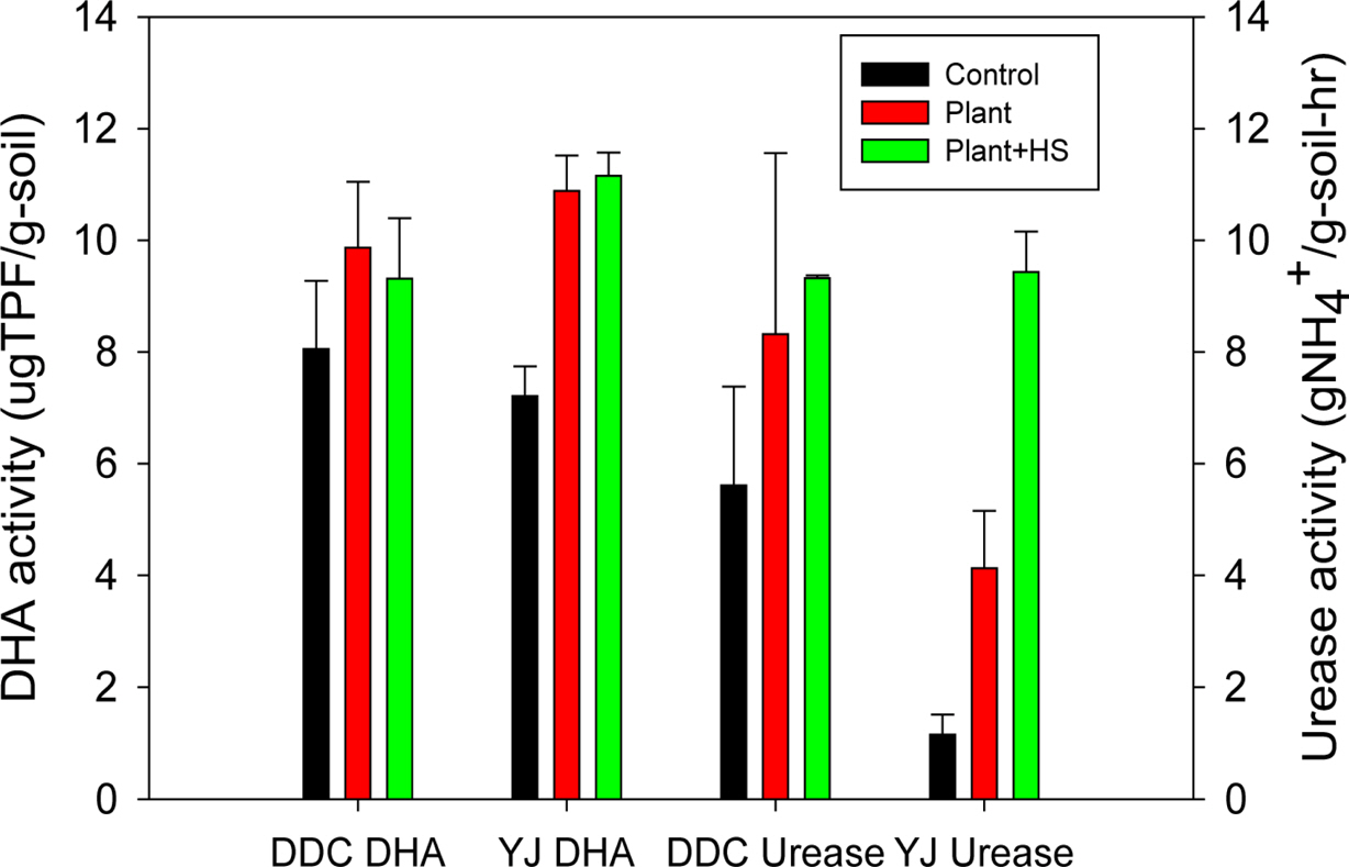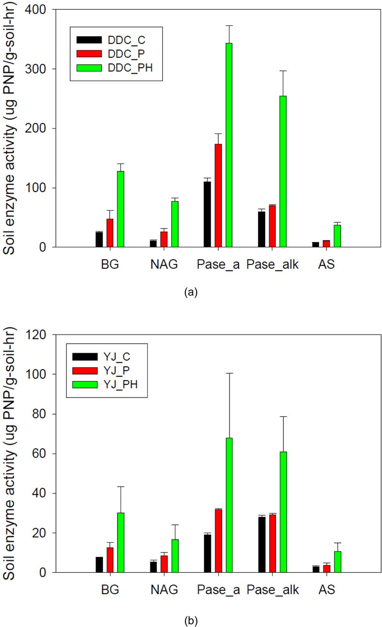 효소활성 중에서 BG, NAG, Pase_a, Pase_alk 및 AS는 식물식재구(P)에서 식물을 식재하지 않고 관수한 대조구에 비해 최소 1배~최대 2.4배 증가한 반면, 식물식재-HS처리구(PH)에서는 약 2배 이상 유의적으로 증가하였다(Fig. 3). DDC토양 PH처리구에서는 대조구에 비해 BG는 5.1배, NAG는 7.1배, AS는 4.7배, Pase_a는 3.1배, Pase_alk은 4.3배 증가하였다. YJ토양에서도 PH처리구에서 대조구 대비 BG는 3.9배, NAG는 3.1배, AS는 3.8배, Pase_a는 3.6배, Pase_alk은 2.2배 증가하였다. HS 처리유무에 따라서도 토양효소활성이 증가하였으며, P처리구에 비해 PH처리구에서 5종 토양효소활성 평균값이 DDC토양에서는 2.9배 증가하였고, YJ토양에서는 2.3배 증가하였다. 토양효소 중에서 DHA와 urease 활성증가는 높지 않았다. DHA는 DDC토양에서 처리구 평균 1.2배 증가하였고, YJ토양에서는 평균 1.5배 증가하였다. Urease활성은 DDC토양에서는 1.5~1.7배밖에 증가하지 않았다. YJ토양에서는 P처리구와 PH처리구에서 각각 3.6배 및 8.2배로 증가하였으나, 이는 YJ토양 대조구 urease활성이 1.2±0.4(mgNH4+/g-soil-hr)로 매우 낮기 때문이며, PH처리구의 9.4±0.7(mgNH4+/g-soil-hr)은 DDC_PH처리구 urease활성과 유사한 값이다(Fig. 3).